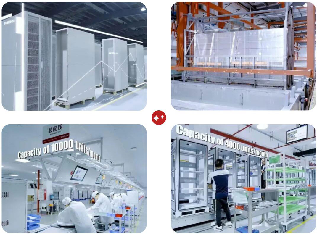 集成车间引进了户外柜生产线,产能平均高达4000台/月)。采用电子看板,可实时显示工序SOP,设有淋水防护测试、性能测试,扫码系统,并单独设立了嵌入式电源ATE测试工位,可实现电源的自动检测和数据记录。同时引进了微站电池生产线,产能高达10000台/月),采用电子看板,设有耐压测试、气密测试,并单独设立了ATE测试、充放电老化测试工位,进行严格、专业的安全、性能及可靠性测试。